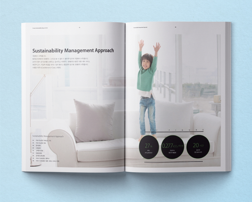 라이프 케어 서비스 분야를 선도하는 코웨이의 지속가능보고서입니다. 깨끗한 환경, 건강한 생활습관에 초점을 맞춘 기업의 이미지에 맞게 일러스트와 어린 아이들의 이미지를 사용해 코웨이의 CSR 활동을 설명하고 있습니다.