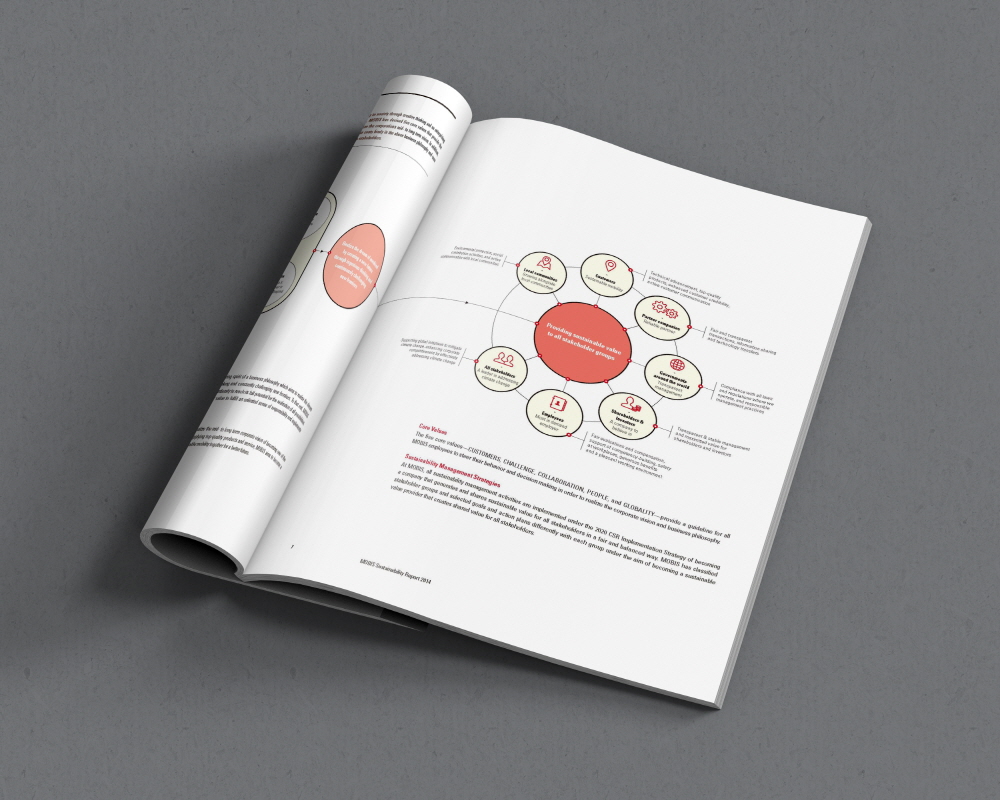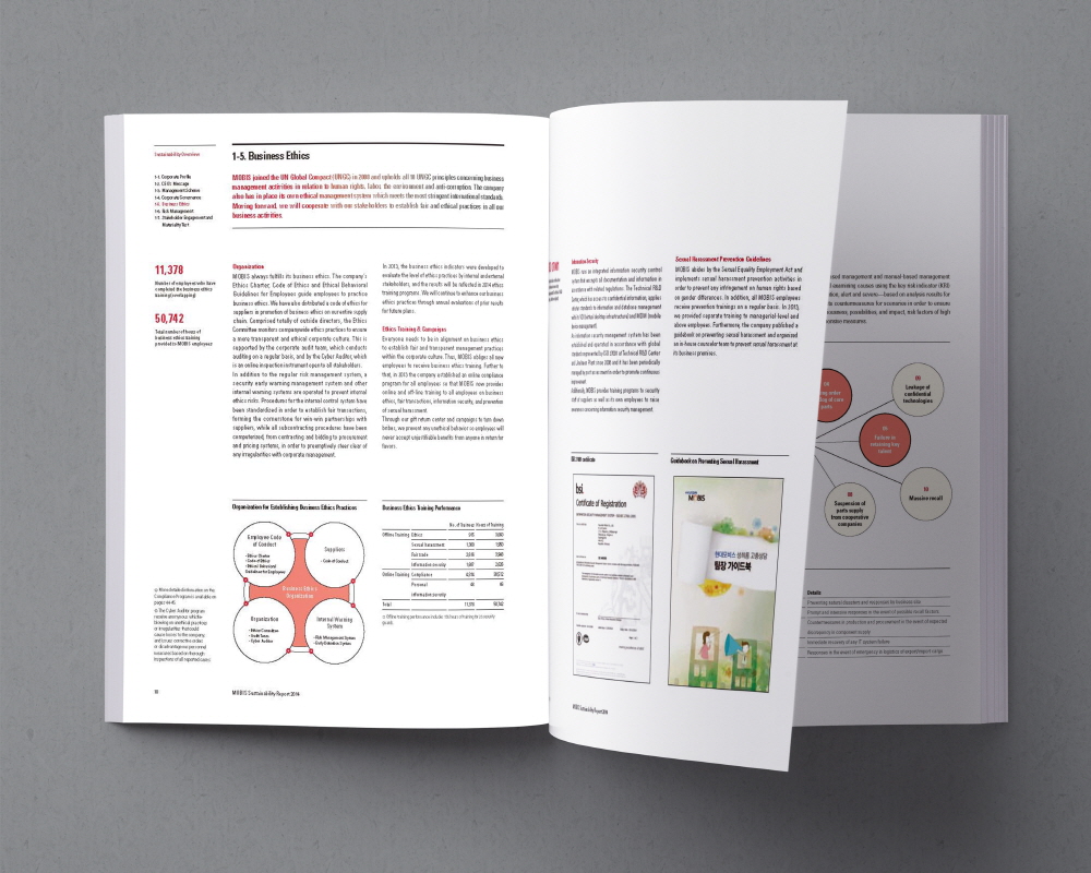 현대모비스의 지속가능보고서 <아름다운 동행>입니다. 아이콘과 숫자를 활용해 인포그래픽을 만들어 이해를 도왔으며, 파스텔 톤의 다양한 색채와 함께 따뜻한 느낌을 주는 붉은 계열 색을 주로 사용하여 CSR을 통해 느낄 수 있는 느낌을 디자인에 녹여내었습니다.