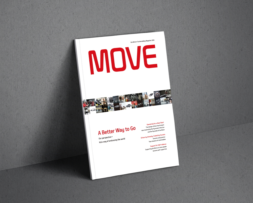 기아자동차의 지속가능보고서 MOVE는 매거진 형식을 차용한 새로운 형태의 지속가능보고서로, 기아자동차의 CSR 신념과 활동을 효과적으로 담아냈다는 평가를 받았습니다. 기획부터 원고작성, 디자인까지 전 분야에 직접 참여하여 제작했습니다.