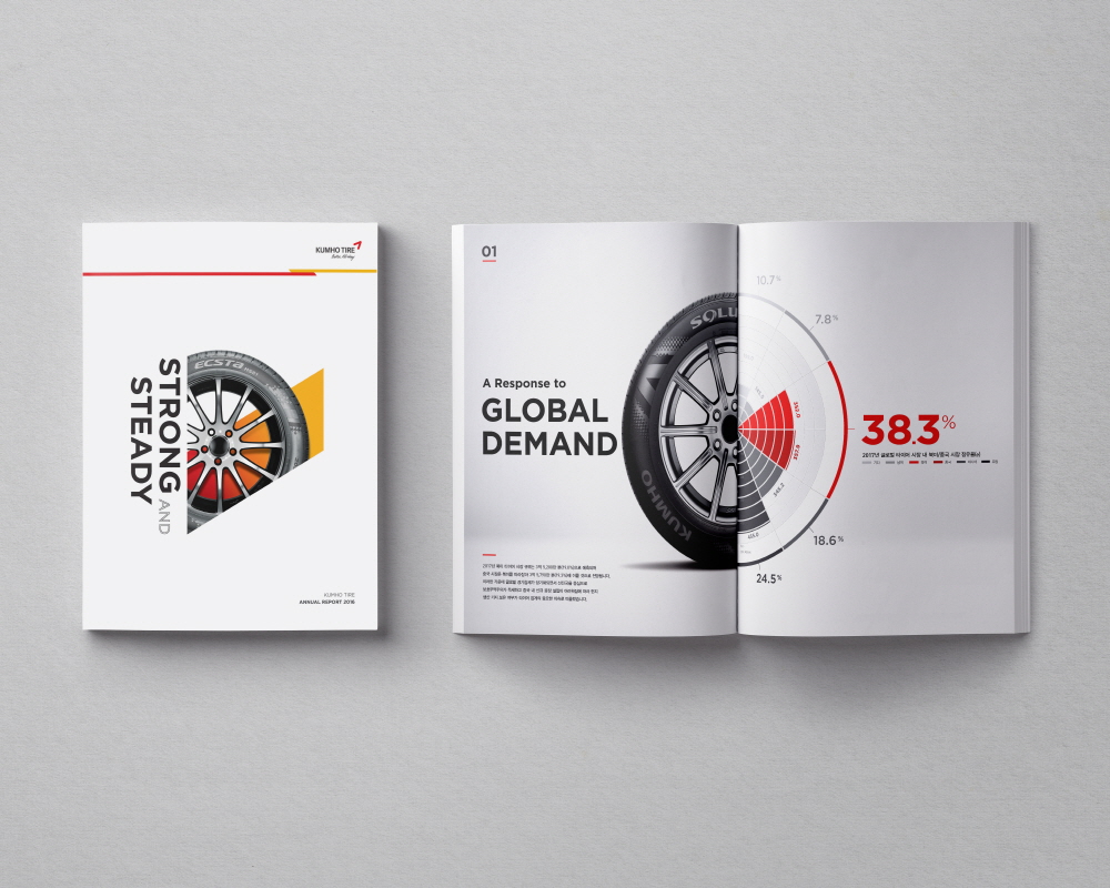 오랜 시간 파트너십을 유지하고 있는 금호타이어의 애뉴얼리포트입니다. 텍스트와 사진, 도표, 일러스트를 적절히 활용해 어려운 내용을 쉽고 재미있게 읽을 수 있도록 디자인했습니다. 2016 애뉴얼리포트는 이미지와 그래프를 데칼코마니처럼 배치하고, 접지를 활용해 많은 정보를 읽기 쉽게 담는 데 주력했습니다.