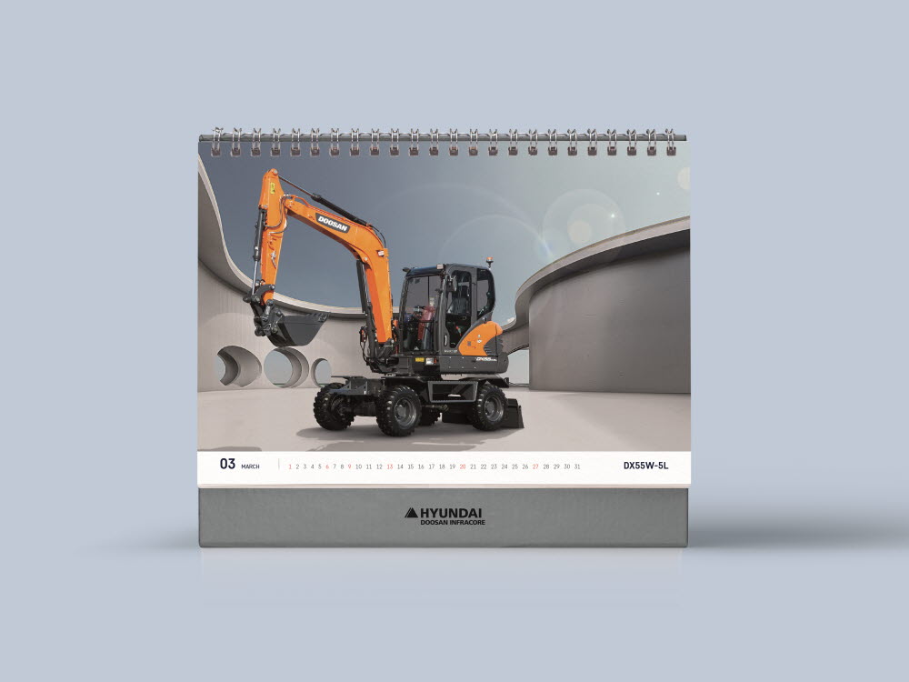 현대중공업그룹의 일원이 된 현대두산인프라코어의 2022년도 캘린더입니다. 본 캘린더는 더 이상 먼 미래가 아닌, 현실로 다가온 미래 도시에서 활약하는 현대두산인프라코어의 건설기계 제품을 보여줌으로써 시장을 선도하는 기업으로서의 이미지를 전달하고자 했습니다.