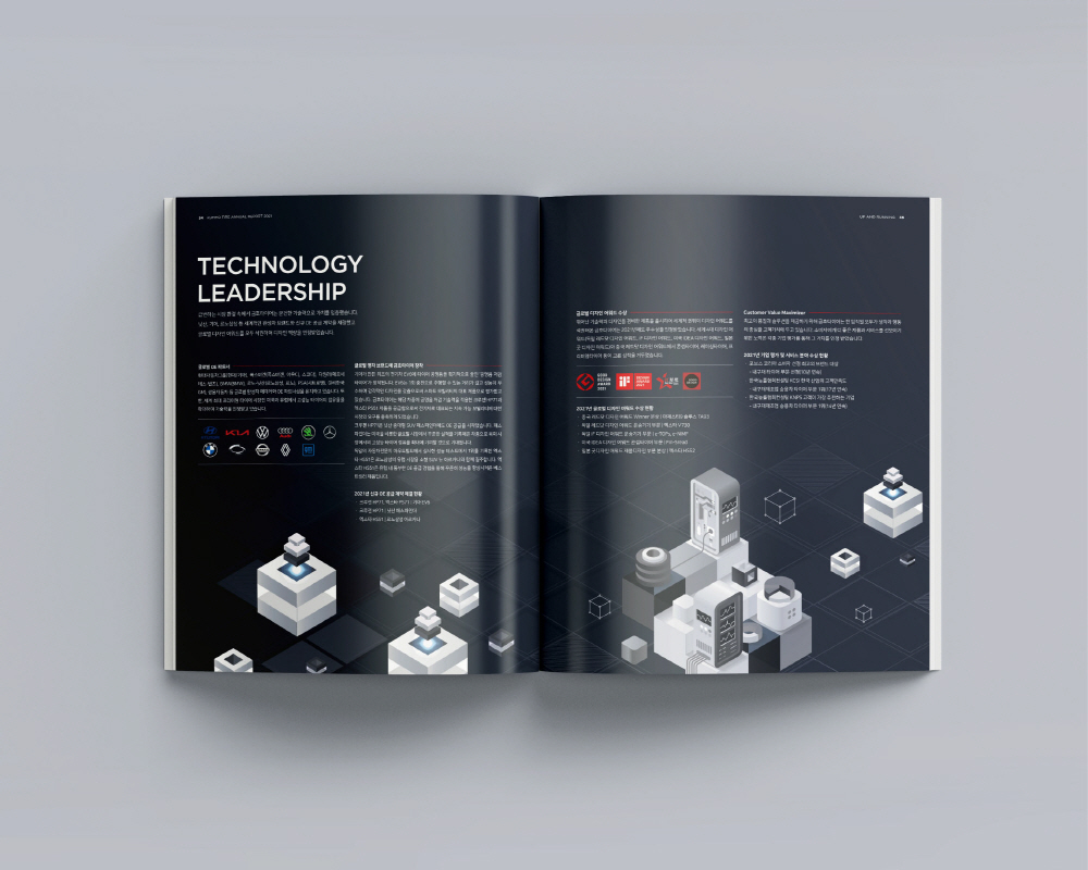혁신을 통해 미래 모빌리티 비즈니스 기업으로 거듭나고자 하는 금호타이어의 2021 애뉴얼리포트입니다. 아이소메트릭 일러스트를 사용하여 시각적인 차별성을 확보하고 주요 내용을 강조하는 한편, 타이어의 특징을 반영한 디자인 요소를 통해 금호타이어의 아이덴티티가 부각될 수 있도록 디자인했습니다.