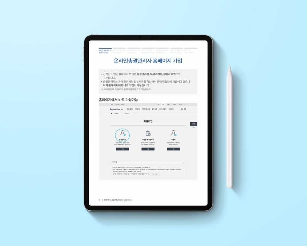 신한카드 법인 홈페이지 사용자들에게 이용방법을 안내하는 E-카탈로그입니다. 신한카드의 판귄 캐릭터를 적극적으로 활용하여 고객이 보다 쉽고 재미있는 방식으로 정보를 얻을 수 있도록 디자인했습니다.