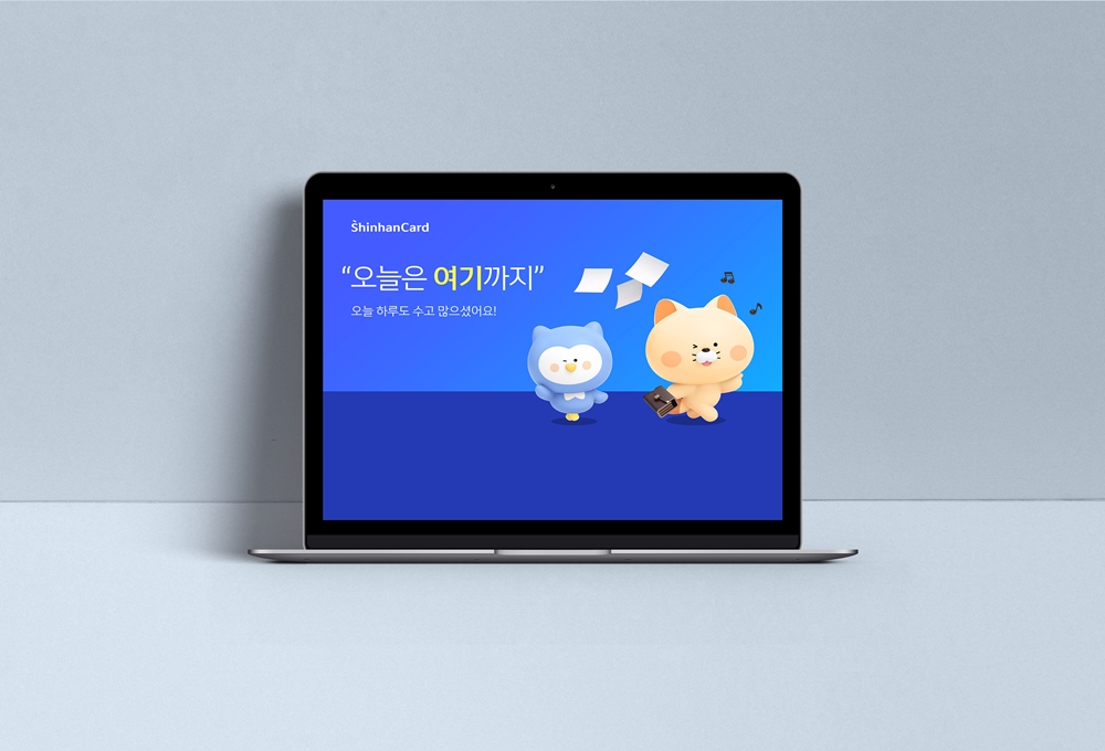 주 52시간 근무제 기반의 효율적인 업무시간 관리를 위한 신한카드의 사내 PC 사용시간 관리 시스템 화면입니다. 신한카드의 캐릭터를 입체적으로 활용한 귀여운 화면 디자인에 간단명료한 카피를 더해 디자인했습니다.